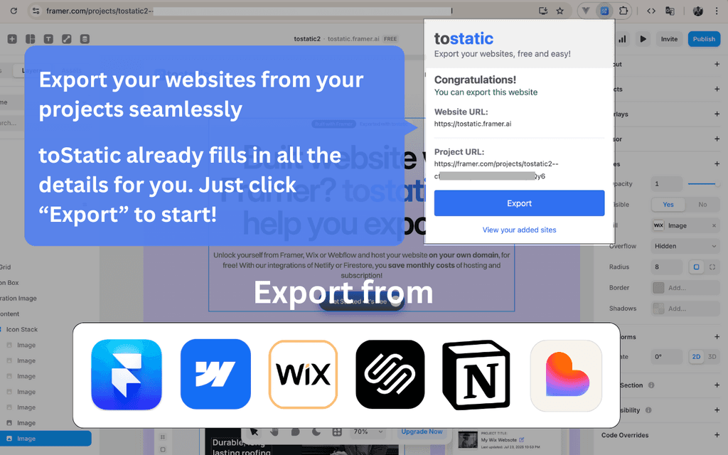 Similar to ExportWiz, FrameXport needs you to signup before you can download zip file of your website. Also, limited to Framer exports.